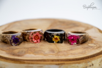 Сухоцветы (незабудки, лютики, хризантемы), эпоксидная смола, ятоба, граб (чёрный), маслянная пропитка. Размеры 15-18.